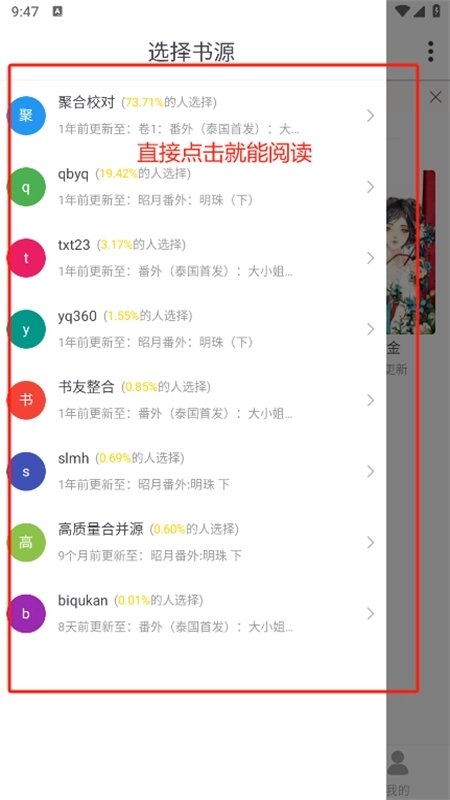 1、启动软件并进入主页面,挑选一本想要阅读的小说 2、接着选择合适的书源,随后进入阅读界面