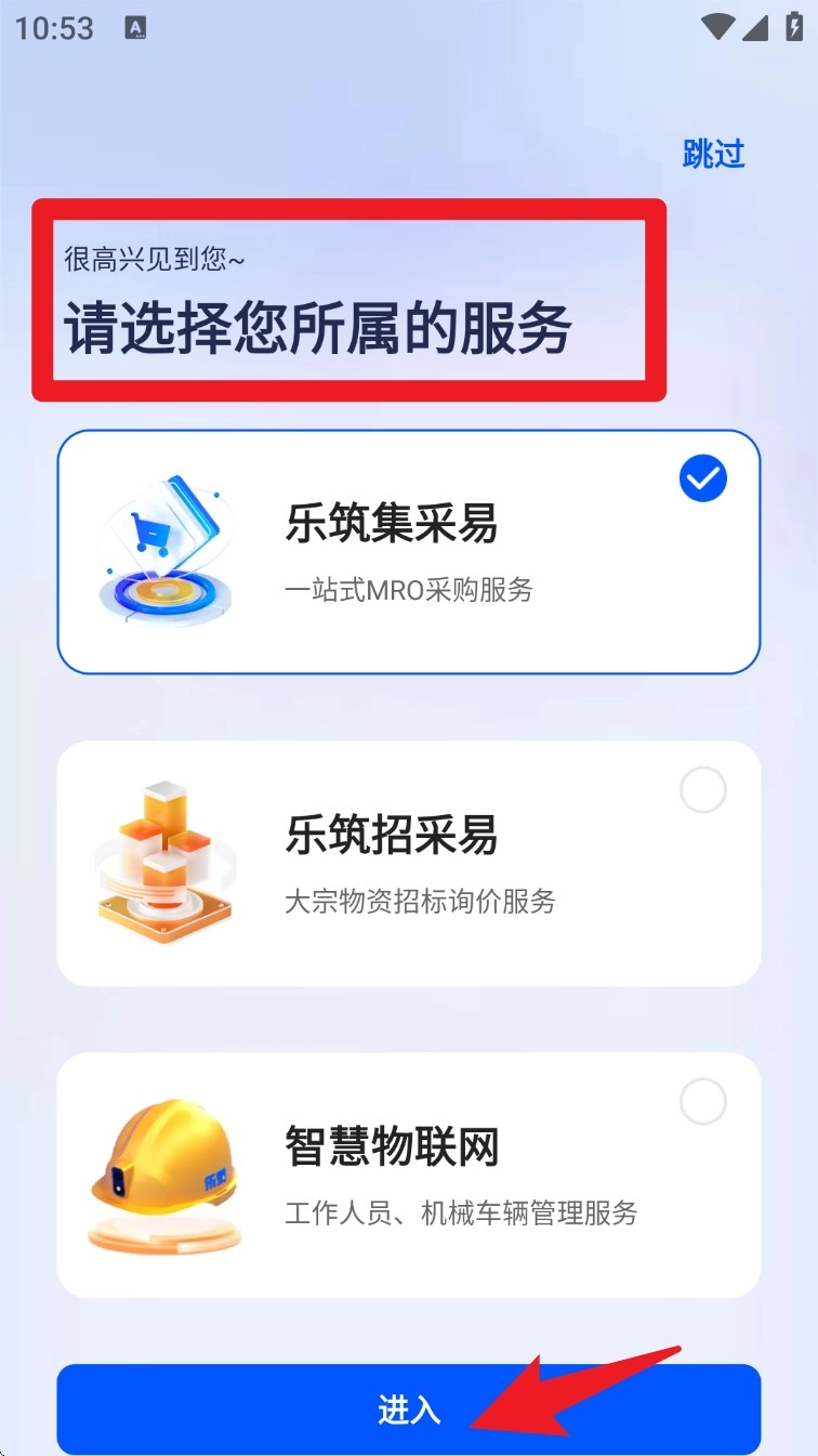 1. 启动乐筑App,首次使用时请选择需要的服务模块,例如“集采易”“招采易”或者“智慧物联网”。