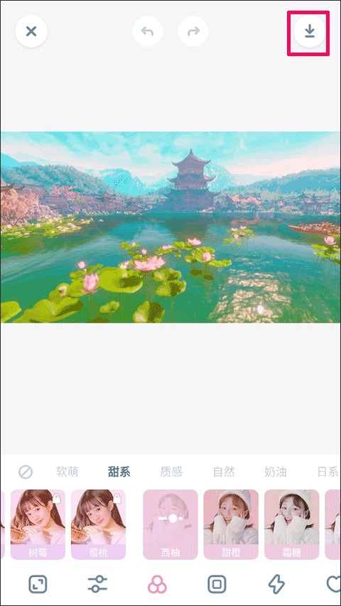 2、在图片处理界面的下方选好你要加工的类型,这里还能通过添加贴纸、调整颜色深度(加大或减少)等方式美化图片,完成加工后,就可以选择并点击右上角的“”选项来保存图片了。