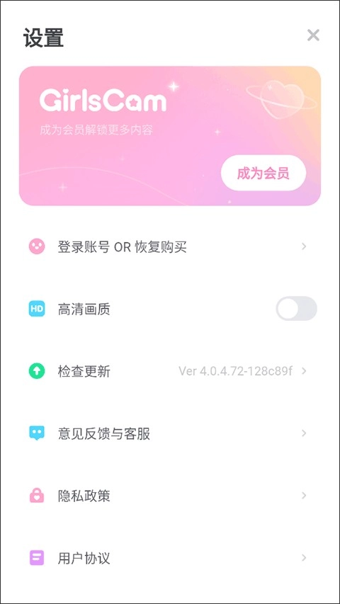 5、接下来,进入设置界面后,大家可以在此选择并点击“成为会员”选项,以获取GirlsCam国际版提供的更多专属服务与功能。