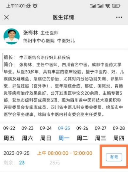 进入科室就能看到医生的简介,避免盲目就医,还能查看医生各时间段的剩余号源情况。可以根据自己的时间安排,选择合适的就诊时段。