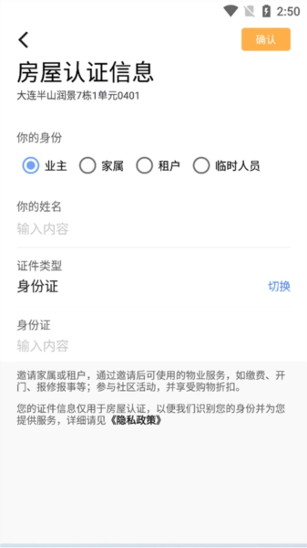 3、然后选择您的身份,业主或家属等等,输入个人相关信息。