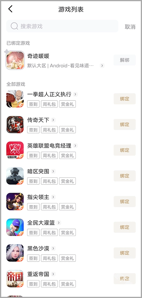 2、进入礼包界面后,在下方选择你想要绑定的内容,点击其右侧的“绑定”按钮;也可以通过搜索栏搜索相关内容进行绑定。