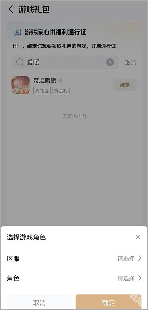3、点击绑定后,会弹出“选择角色”的窗口,选择好区服与角色,点击确定,就能完成绑定。