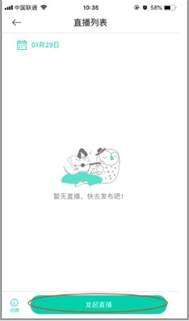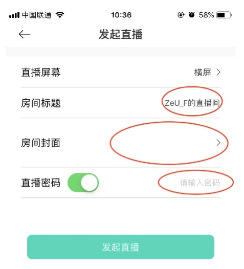 点击“发起直播”进入直播列表页面,点击页面底部【发起直播】按钮,进行直播的相关设置。