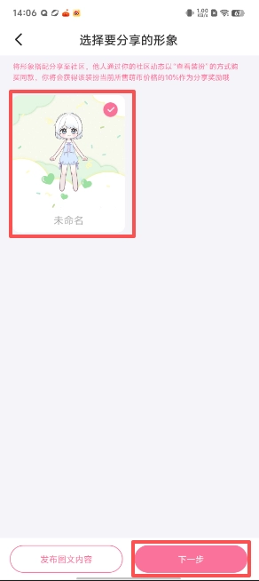 2、点击“+”,选择想要分享的形象并找到页面上的“下一步”