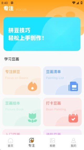 3、在专注页面里,软件给用户设置了专注拼豆、豆画清单、豆画绘本,还有打卡豆画、入门豆画等各类不同的版块。