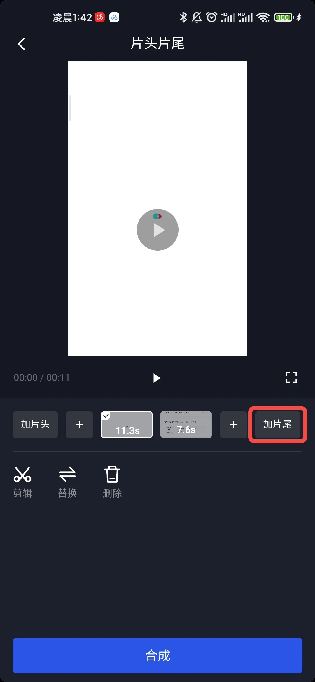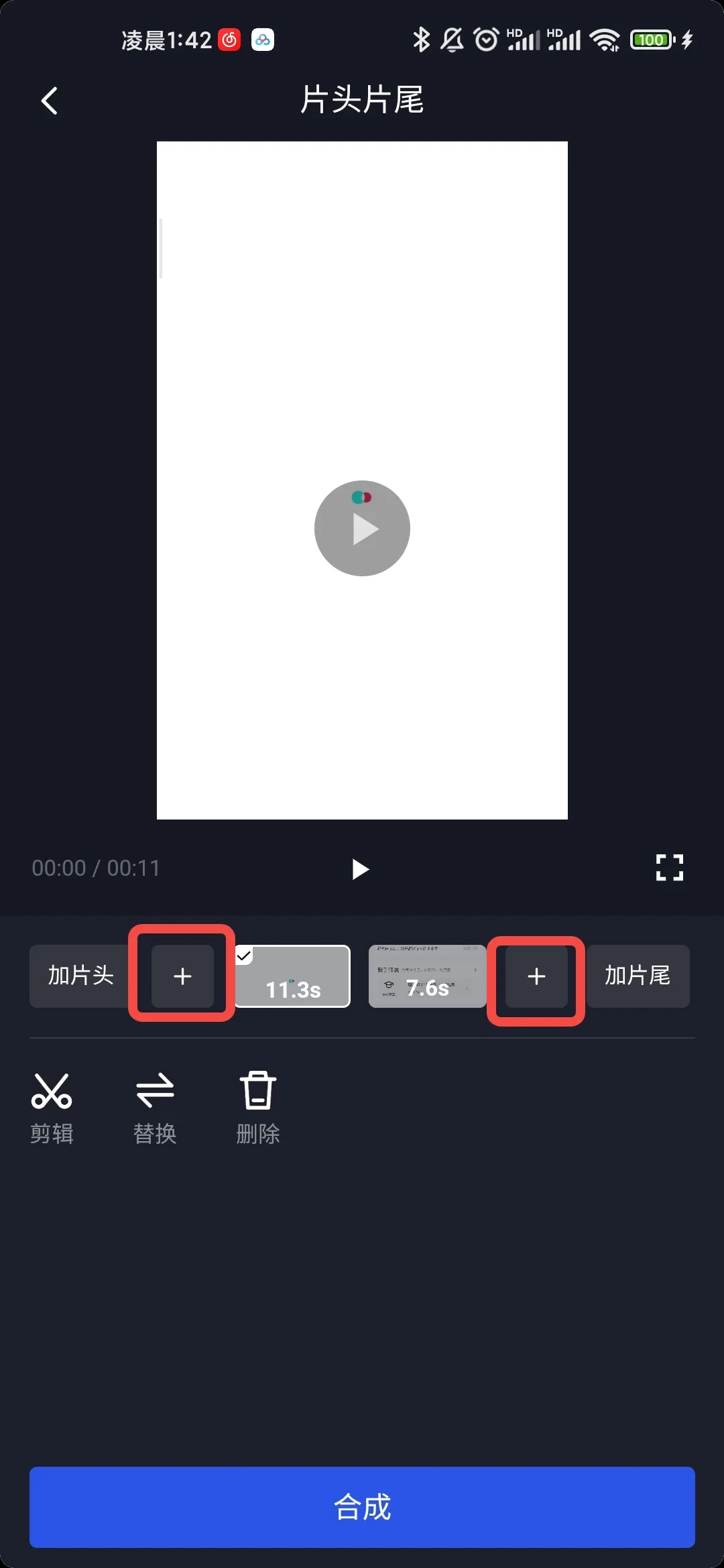 回到原界面后,点击“+”号,就能用相同的方法在已有的视频前面或后面继续上传多段视频;而点击“替换”或“删除”按钮,则可以分别对某一段视频执行替换和删除的操作。