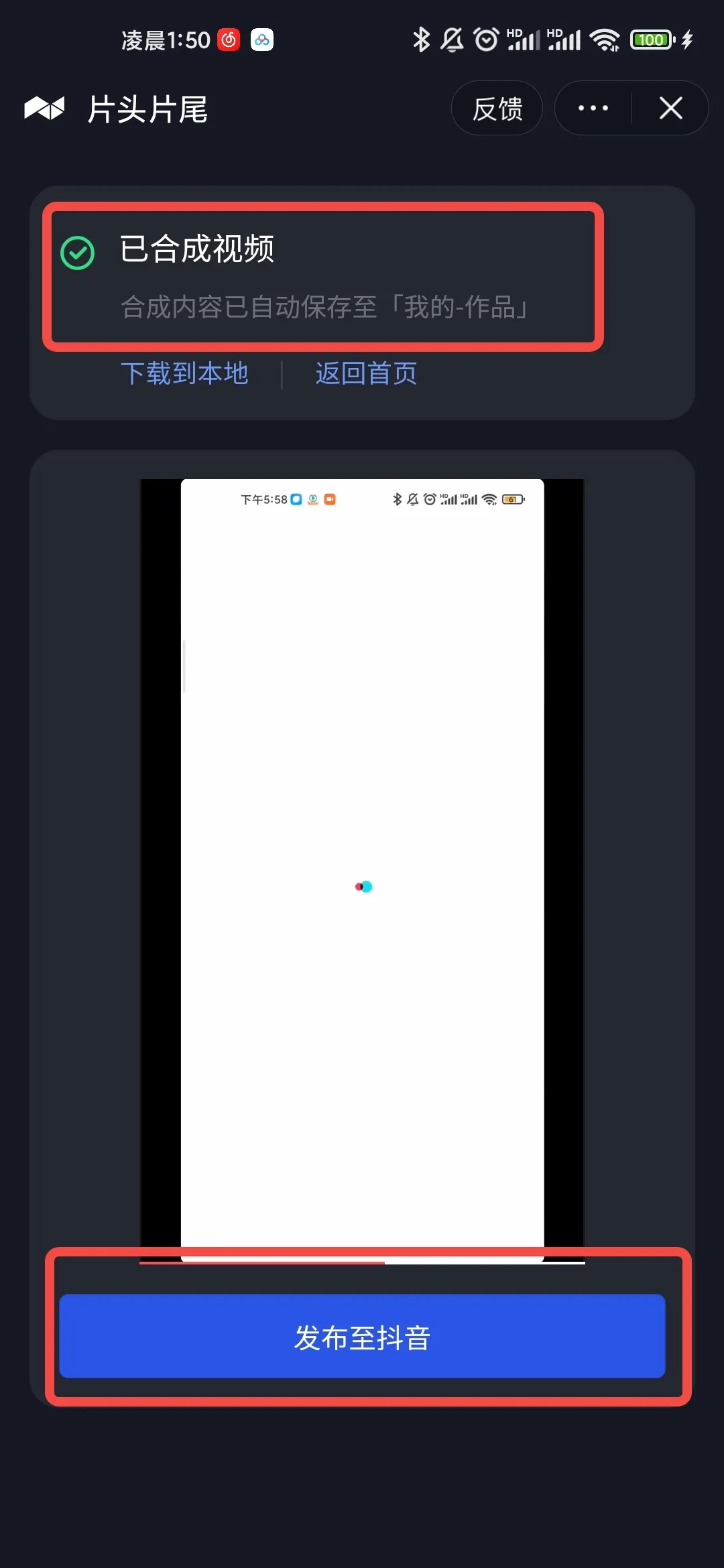 所有操作完成后,点击下方的“合成”按钮就能结束视频编辑,视频会自动保存到“我的-作品”里,你也可以选择“发布至抖音”。