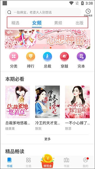 1、打开洋葱小说阅读软件的主界面后,可选择精选、女频、男频或出版类小说进行阅读,也能看到本期必看、精品畅读等板块;
