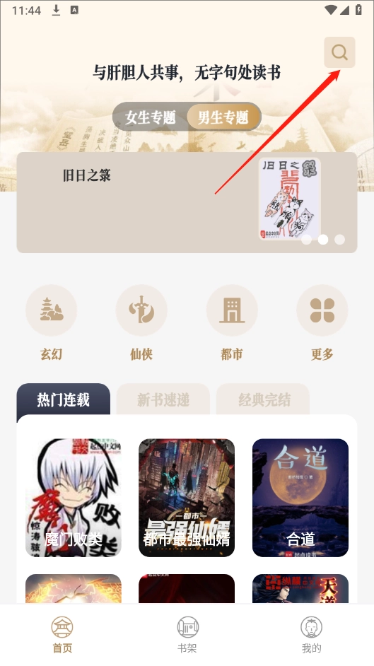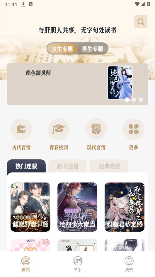 首页设有详细的小说分类,覆盖男女生板块,内容分类十分细致,包含言情、武侠、科幻等多种类型。