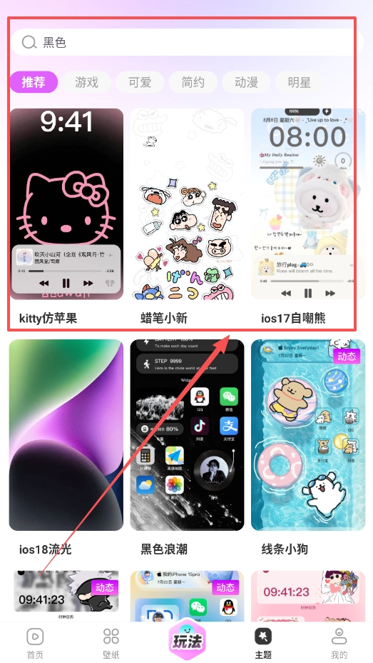 3、要是你热衷于更换主题,可前往主题页面浏览黑色、可爱、简约等各类风格,像kitty仿苹果、蜡笔小新这类热门主题都能找到。