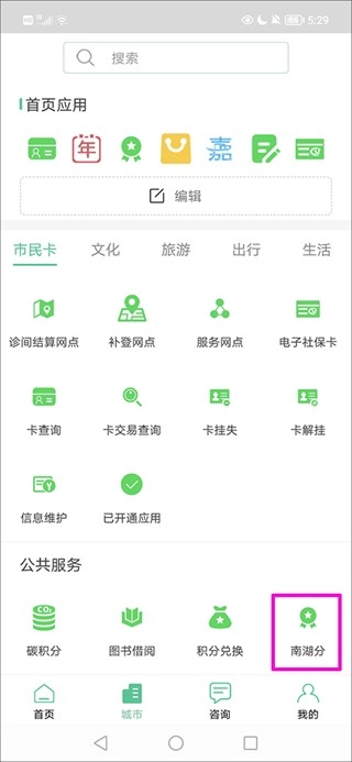 2、在市民卡界面找到并点击“南湖分”选项;