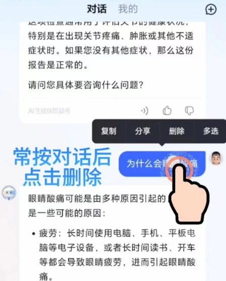 1.长按对话模块对话信息,会出现“删除”、“多选”按钮。