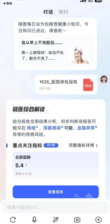2.讯飞晓医能够对各类检查报告和体检报告展开解析,帮助用户全方位了解自身的健康状况。