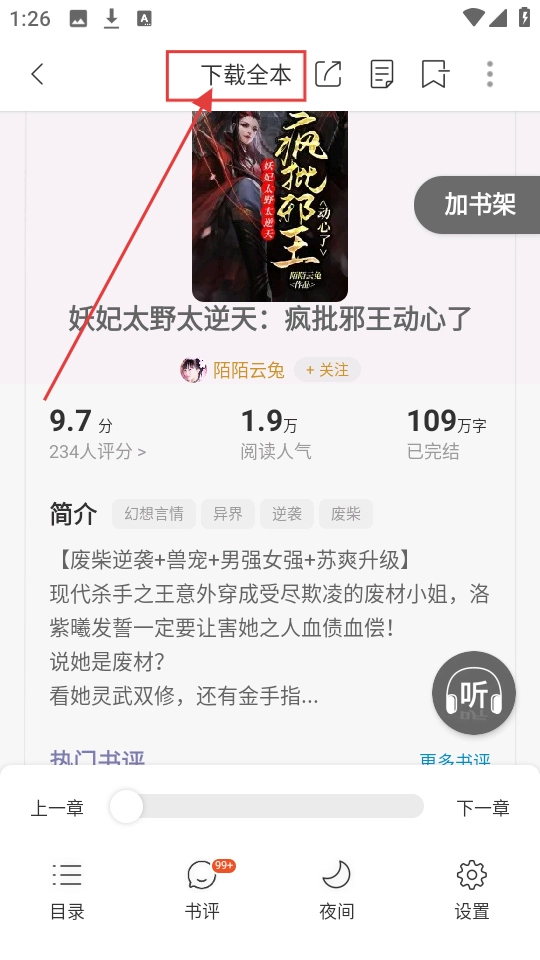2、进入小说详情页后,找到页面顶部的【全本】按钮,点击该按钮即可进入对应的选择界面。