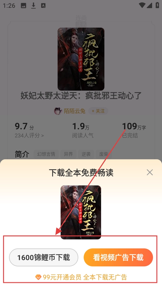 3、点击【全本】按钮后,页面会弹出获取方式的选项,你可以选择消耗【1600锦鲤币】解锁,或者通过【观看视频广告】来获取,选定其中一种方式就能完成操作啦。