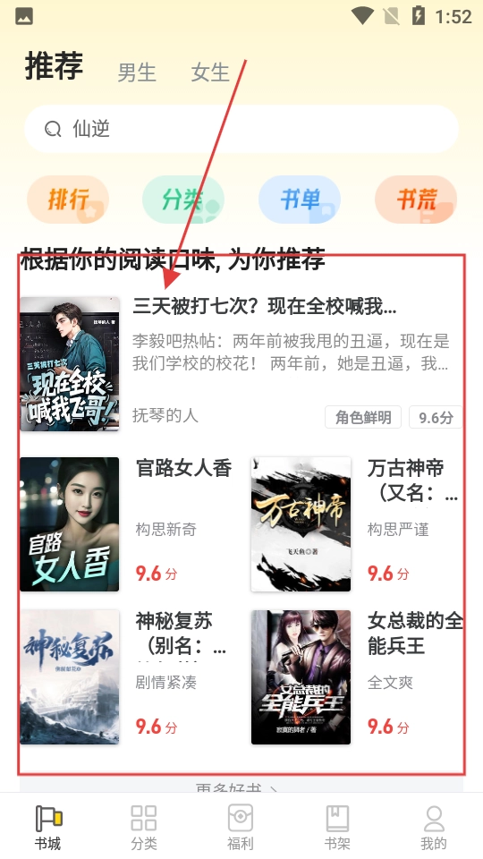 1、打开小说软件后,会看到系统推荐的小说列表,要是对其中某本小说感兴趣,直接点击它的封面或者标题就可以了。