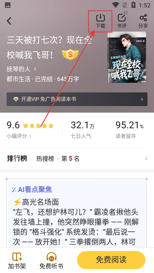 2、进入小说详情页,能看到评分、人气等信息,若要小说,点击【】哦。