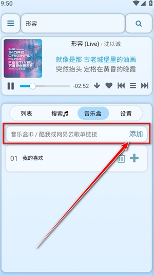 6、在搜索栏粘贴音乐盒id、酷我歌单链接或网易云歌单链接,接着点击添加按钮,即可完成歌单导入操作。