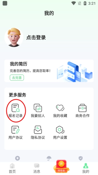 2、在我们页面里的更多服务中找到报名记录,点击进入。