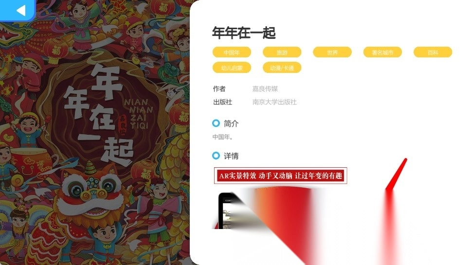 1、点击书架上的《年年在一起》封面图书,进入绘本详情页面查看内容简介与出版信息。