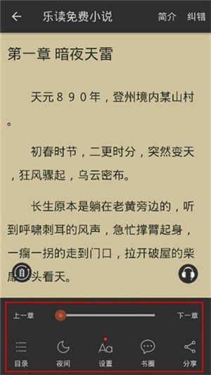 3、轻点屏幕就能调出菜单,可通过目录跳转至想看的章节,还能切换夜间模式和使用一键听书功能。