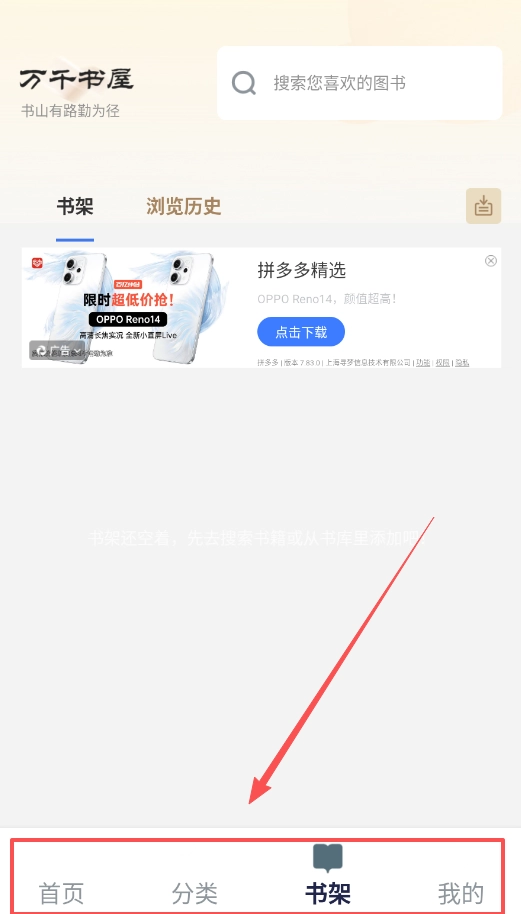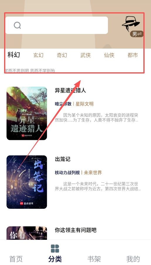 1、首先打开万千书屋,在底部导航栏选择“分类”按钮,可以看到科幻、玄幻、奇幻等不同类型图书分类。