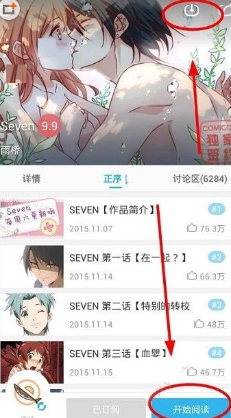 4、进入“seven漫画”的阅读界面后,点击“开始阅读”按钮即可在线阅读漫画;若点击“按钮图标”,则会进入缓存页面。