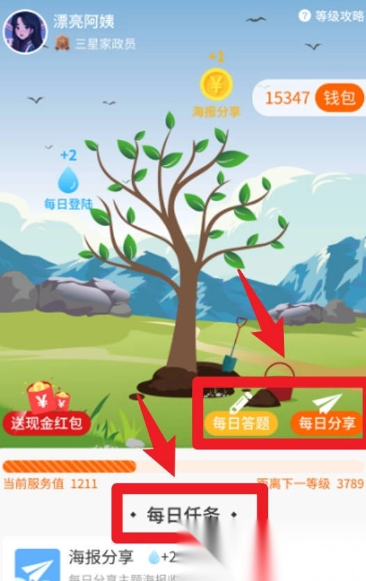 5、每日任务板块设有签到、答题和分享功能,完成这些任务能获取服务值及奖励,有助于提高个人收益。