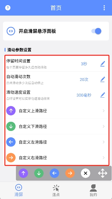 3、可根据自身需求灵活设置连点器的各项参数,对滑动相关的点击设置进行调整。