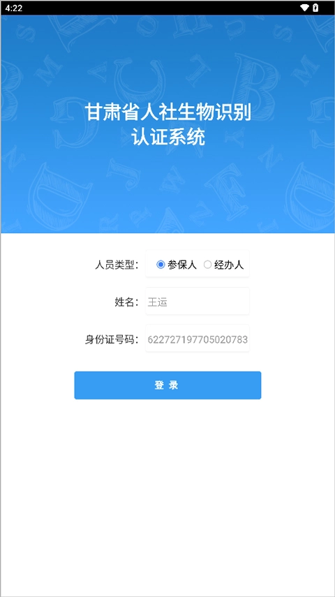 用户在本站完成甘肃人社认证后,打开应用,进入页面后以参保人身份输入正确的姓名和身份证号码,然后点击登录。