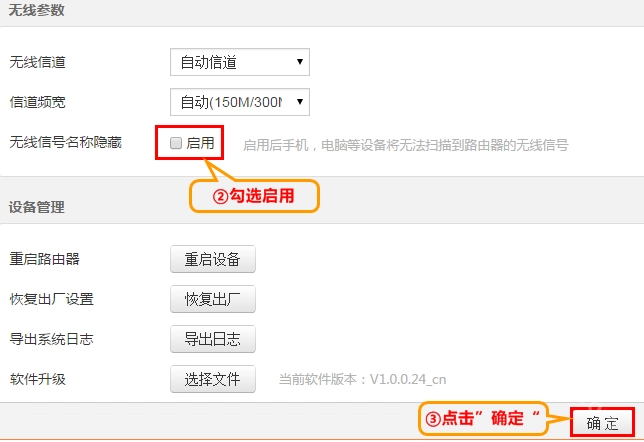 登录路由器管理界面后,依次进入“系统管理”板块,找到“无线信号名称隐藏”选项,勾选“启用”,再点击“确定”按钮保存设置,详细操作步骤可参照图示。