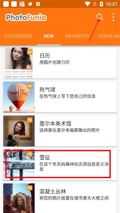1、首先进入photofunia雪地写字软件,我们可以点击首页的雪征,也可以搜索“雪地”,这两个功能是有区别的;