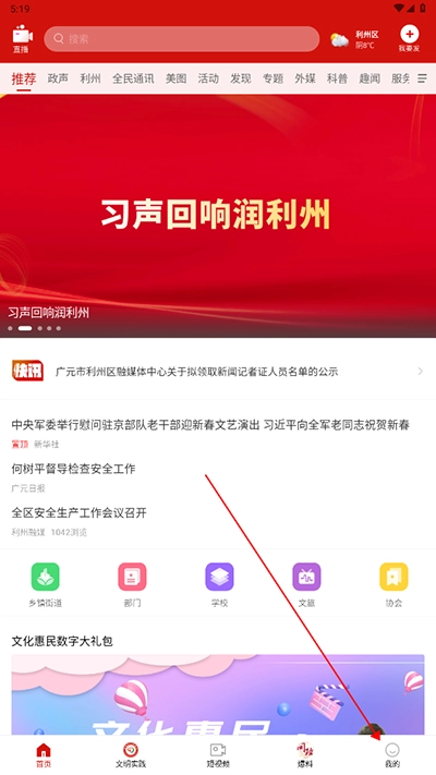 整合政务服务与生活便民功能,提供办事指南、政策查询、社区通知等实用服务,助力居民高效解决日常需求。1. 打开利州融媒App的首页,点击底部导航栏里的“个人中心”按钮;