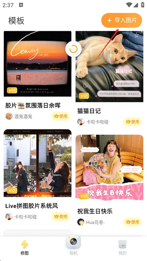 1、首先,进入黄油相机App点击右上角的导入图片;