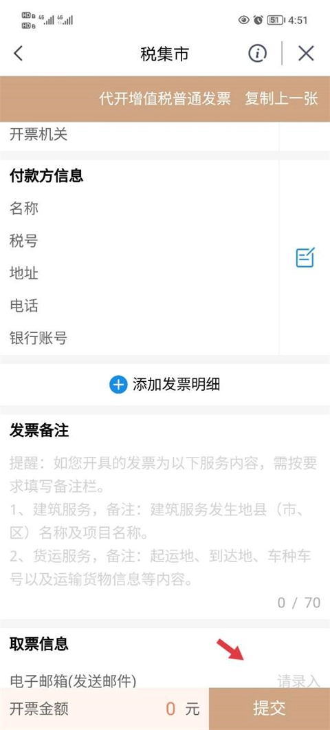 5、准确填写发票所需信息,确认无误后点击【提交】,即可完成申请。
