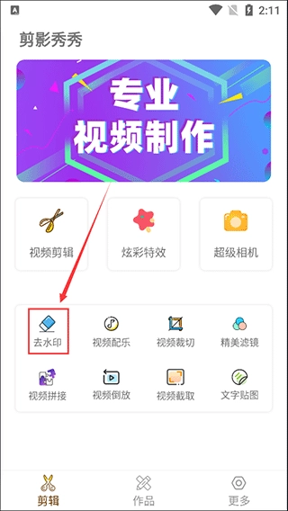 1、在本站的剪影秀秀中,进入【剪辑】页面后,能看到【视频剪辑】、【炫彩特效】、【超级相机】、【去水印】等各类功能,选择并点击【去水印】功能进入即可。