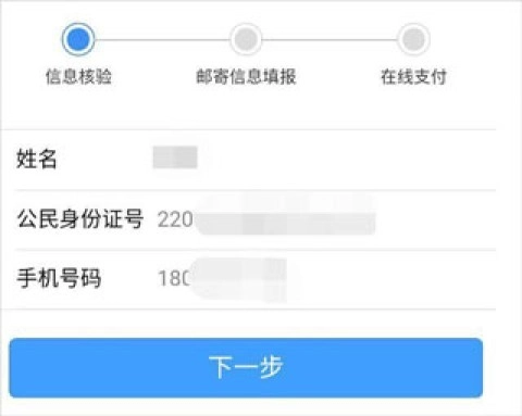 4、系统会自动填充你的个人身份信息,确认信息准确无误后,点击“下一步”,接着填写身份证的邮寄地址。