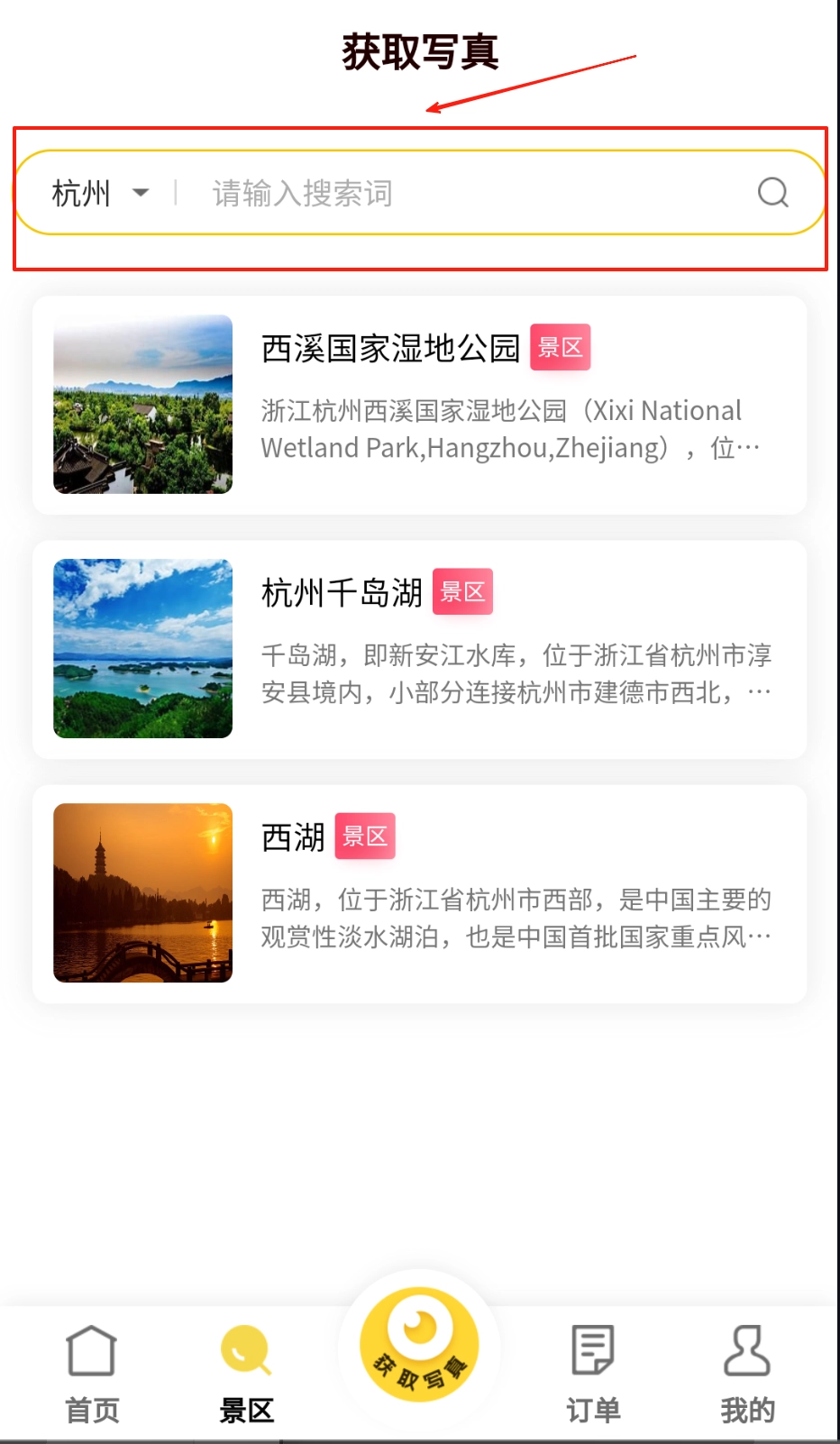 2、通过地图定位或关键词检索选择心仪景点打卡拍摄地。