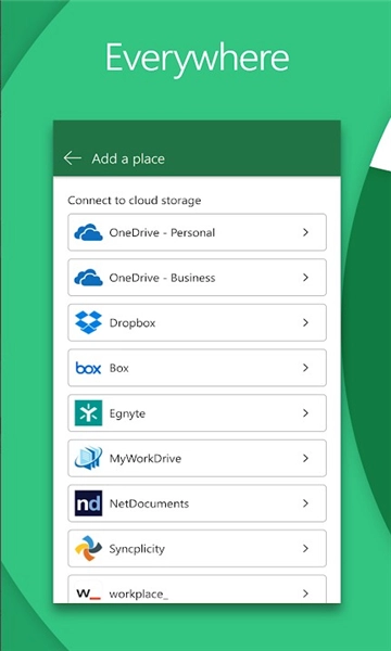 - 电子表格随时可用。借助对OneDrive、OneDrive for Business、SharePoint、Dropbox、Google Drive和Box的支持,无论何时需要,你都能访问到文件。