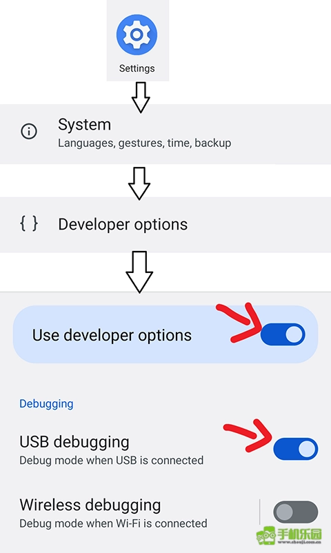 2、启用“开发者选项”和“USB 调试”。