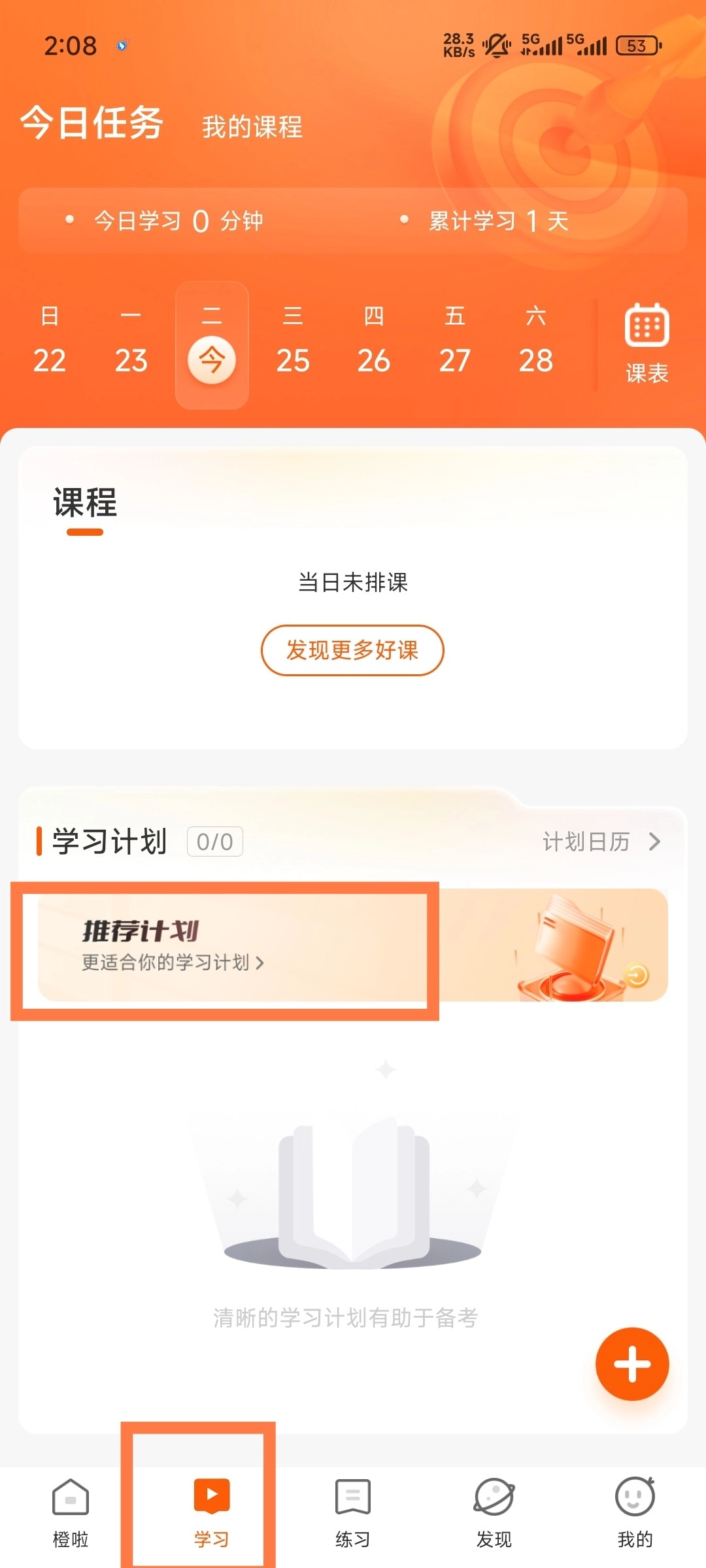 1、打开软件点击学习板块,这里可以看到有推荐学习计划