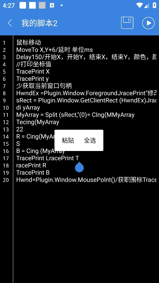 5、随便找了一个脚本代码填写进去,写完代码之后点击右上角的运行