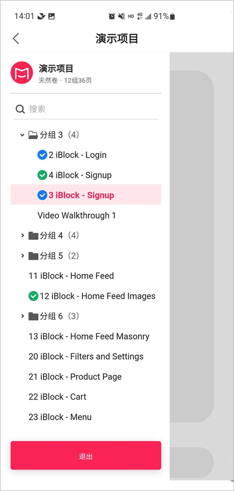 若想在项目里查看所有设计稿,点击“立即演示”就能进入浏览模式。演示时,用双指缩放可以自由调整视图,方便查看细节。