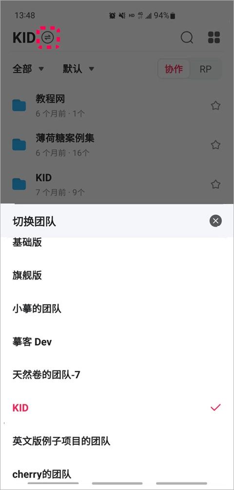登录后,点击顶部团队名称右侧的切换按钮,在弹出的下拉列表里挑选其他团队。