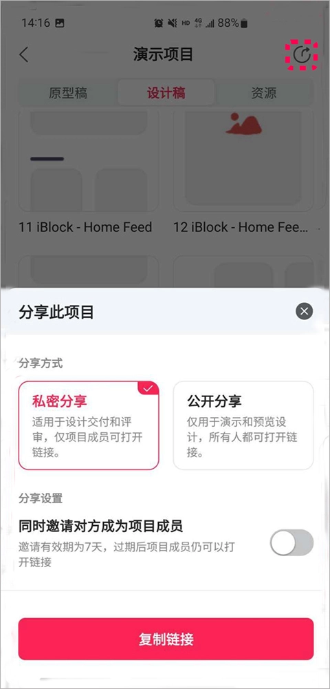 在项目首页的右上角,点击“分享”图标,就能复制链接并发送给其他人,从而实现在线即时预览的功能。