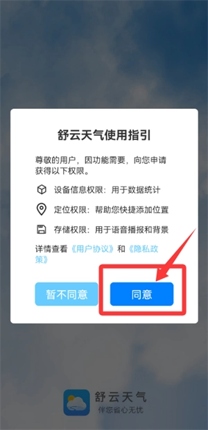 1、启动舒云天气应用,查看使用指引与权限说明后点击同意。
