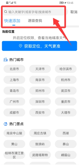 2、在搜索栏输入城市名称关键字或拼音首字母,即可查找目标区域。