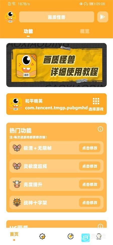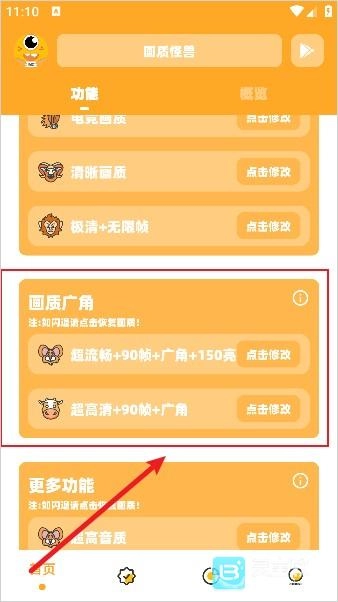 画质怪兽超广角是一款能让你直接体验多种不同画质修改的工具类软件。在这款软件里,你可以实时获得120帧的超高帧率,还能全面开启更高的画质内容,让视野更清晰、操作更丝滑。它能帮你实现从画面到流畅度的全方位提升,只需几秒钟就能完成画质优化,就算是新手也能轻松上手。